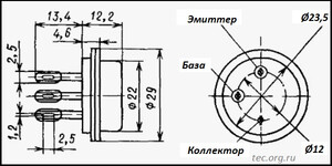 2Т808А (КТ808А) - транзистор большой мощности высокочастотный структуры NPN. Выполнен в металлическом корпусе со стеклянными изоляторами и жесткими выводами.
