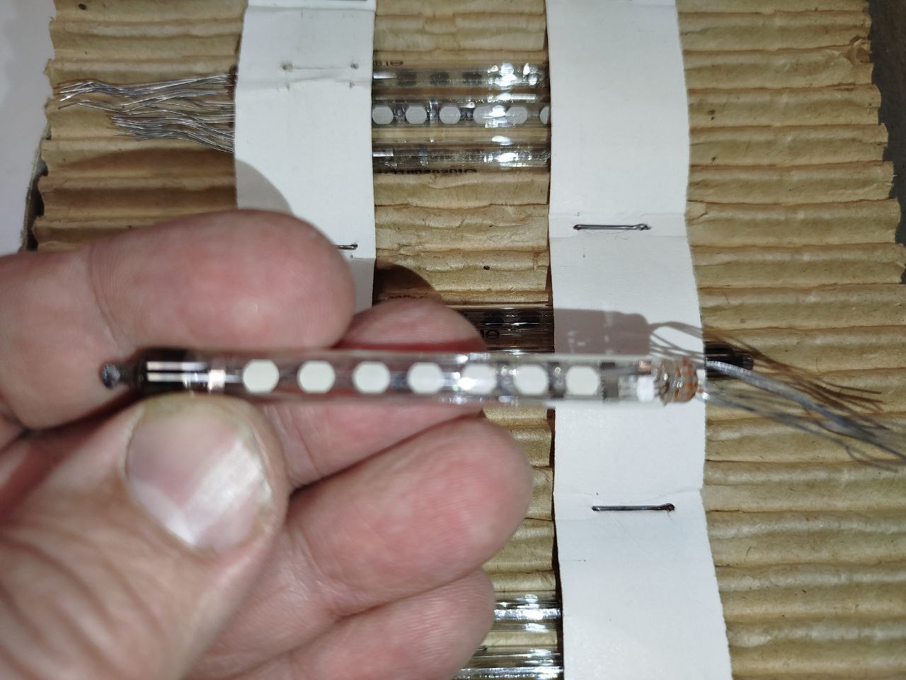 ИВЛМ1-1/7- люминисцентный индикатор зелёного цвета свечения для построения матричных табло, бегущих строк. часов и т.п. Индикатор ИВЛМ1-1/7 выполнен в стеклянной колбе с гибкими выводами. Индикация осуществляется через боковую поверхность баллона. Аноды прибора выполнены в виде семи точек. Как правило один индикатор образует один столбец информационного поля. На одно знакоместо (символ) используется 4-5 индикаторов ИВЛМ1-1/7.