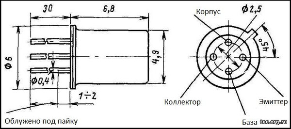 Выпускаются в металлостеклянном корпусе с гибкими выводами. Выводы эмиттера, базы и коллектора электрически изолированы от корпуса транзистора. Корпус транзистора электрически соединен с четвертым выводом и может быть использован в качестве экрана.