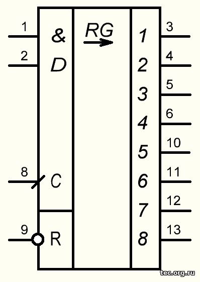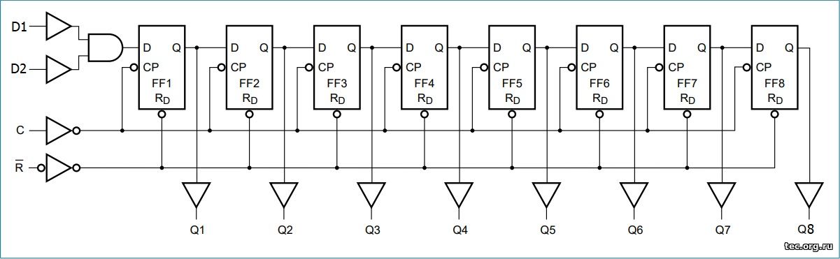 Прием данных с последовательных входов D и сдвиг их в регистре осуществляется по положительному перепаду уровня сигнала на тактовом входе C.