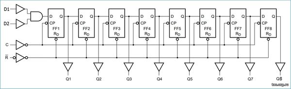 74LS164 (КМ555ИР8) - простой сдвиговый регистр. Он имеет два входа данных D, объединенных по "И", тактовый вход C, инверсный вход сброса R и параллельные выходы Q1-Q8.