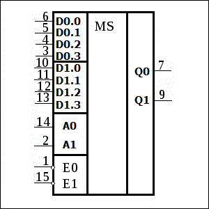 Двоичный адрес на входах A0,A1 определяет номера входов Dx.0..Dx.3, с которых на выходы Q мультиплексоров будет подаваться информация.
