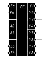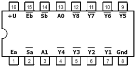 Микросхема имеет два адресных входа A0 и A1 (выводы 3 и 13). Они служат для одновременного управления выходными состояниями обоих дешифраторов. В каждом дешифраторе имеется отдельный стробирующий вход Sa и Sb (выводы 2 и 14), а также по одному информационному входу Ea (вывод 1), и Eb (вывод 15). Информационный вход первого дешифратора прямой, а второго - инверсный.