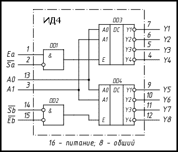 Микросхема КМ555ИД4 представляет собой сдвоенный дешифратор/демультиплексор. Он может выполнять функции: