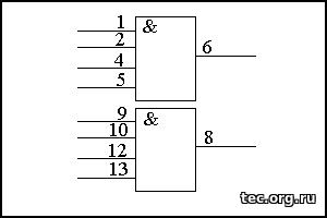Микросхема КМ555ЛИ6 представляет собой 2 логических элементов 4И. Относится к одной из стандартных серий ТТЛ и предназначена для работы при напряжении питания +5V.